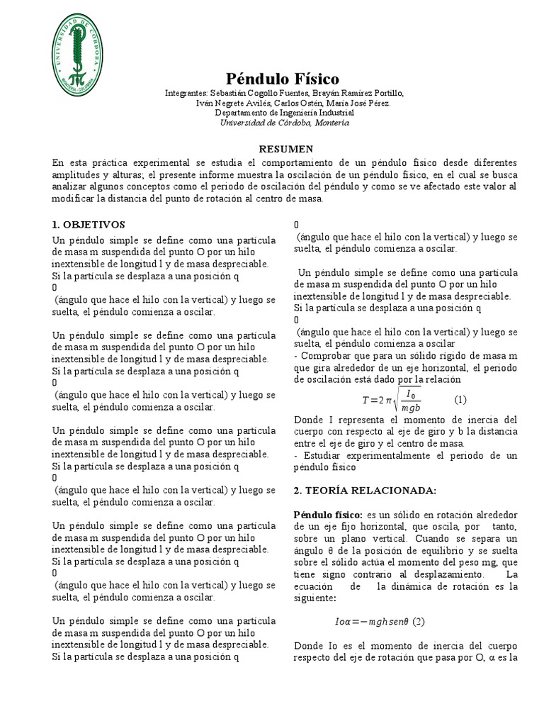 En esta práctica experimental se estudia el comportamiento de un péndulo físico desde diferentes