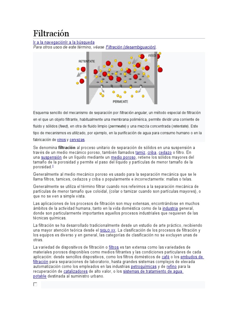 Se denomina filtración al proceso unitario de separación de sólidos en una suspensión a
