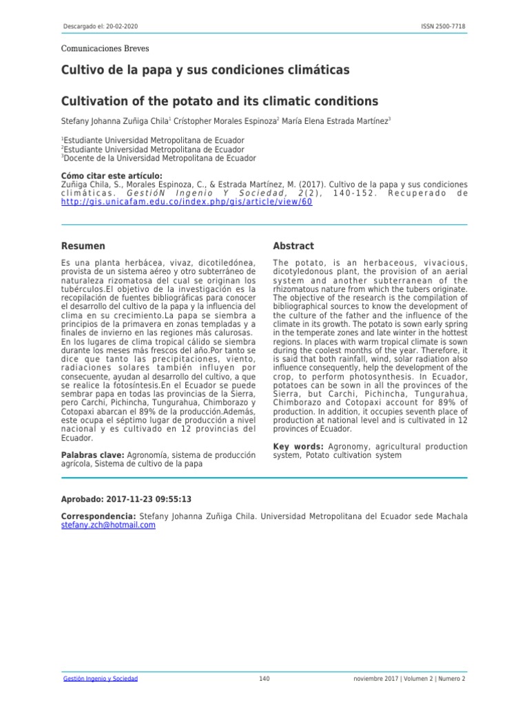 Zuñiga Chila, S., Morales Espinoza, C., & Estrada Martínez, M. (2017). Cultivo de la papa y sus condiciones
