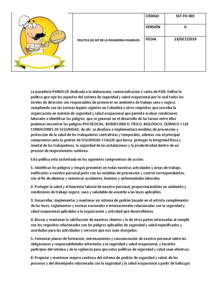 POLITICA DE SST DE LA PANADERIA PANKELOS FECHA 23/OCT/2019