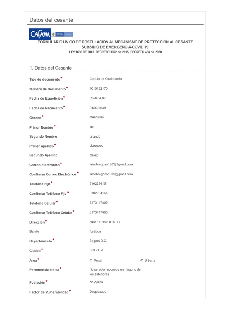 Cafam informa que para la radiación del Formulario Único de Postulación al Mecanismo de Protección al Cesante /