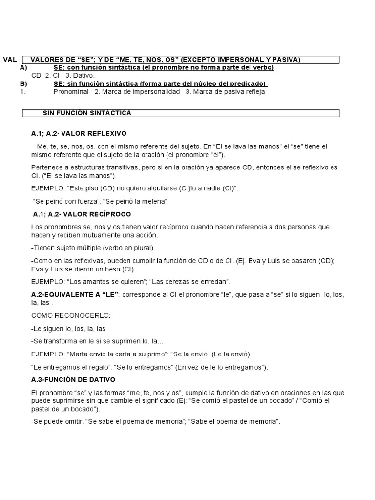 VAL VALORES DE “SE”; Y DE “ME, TE, NOS, OS” (EXCEPTO IMPERSONAL Y PASIVA)