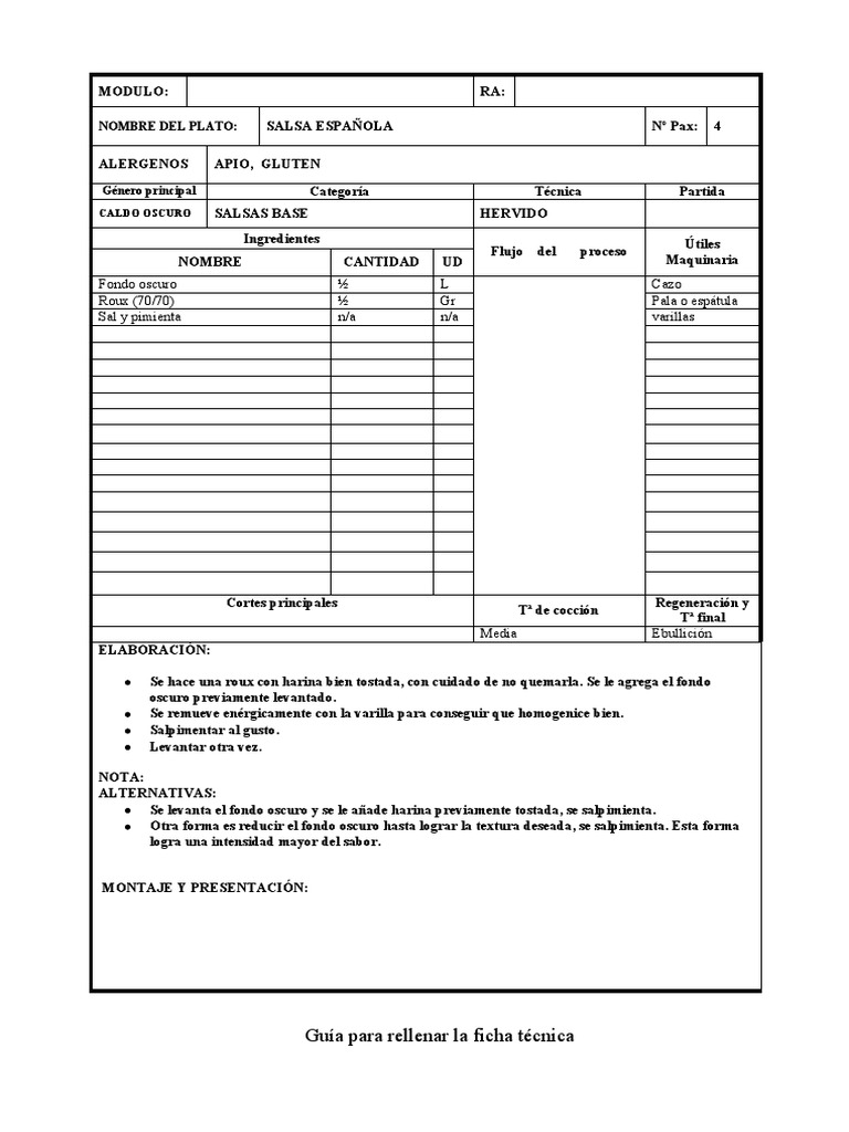 NOMBRE DEL PLATO: SALSA ESPAÑOLA Nº Pax: 4