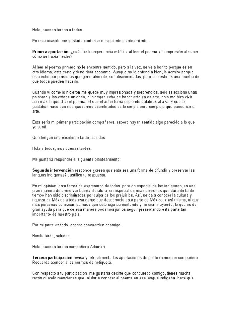Con respecto a tu participación, me gustaría decirte que concuerdo contigo, tienes mucha