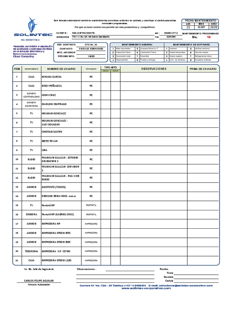 CLIENTE : ASOJUNTAS SIBATE NIT: 832001477-2 MANTENIMIENTO PROGRAMADO