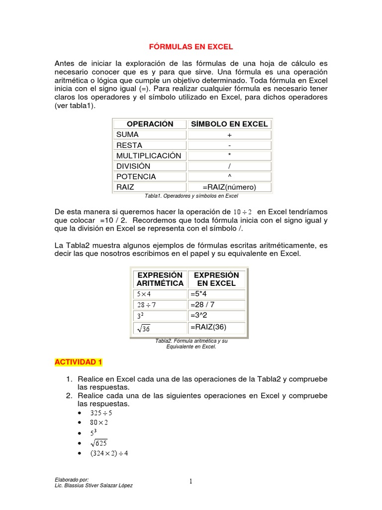 1. Realice cada una de las siguientes operaciones en Excel y compruebe la
