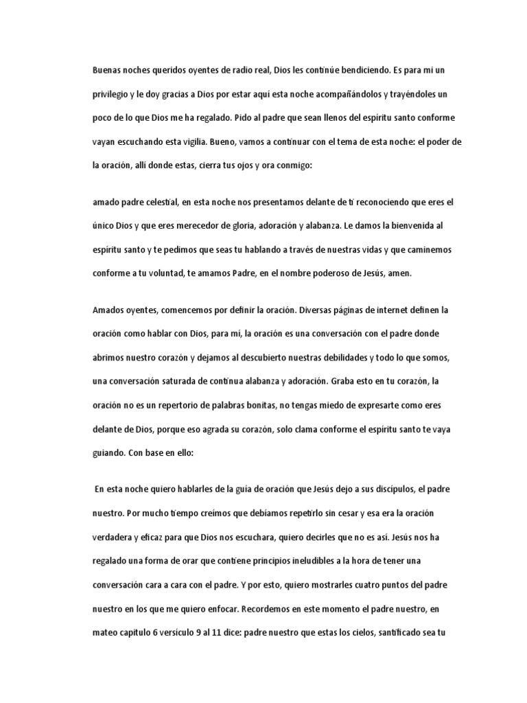 En esta noche quiero hablarles de la guía de oración que Jesús dejo a sus discípulos, el padre