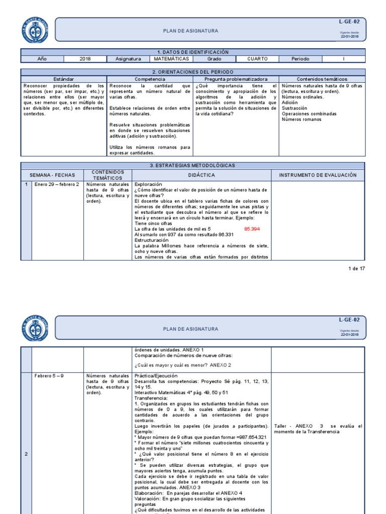 Año 2018 Asignatura MATEMÁTICAS Grado CUARTO Periodo I