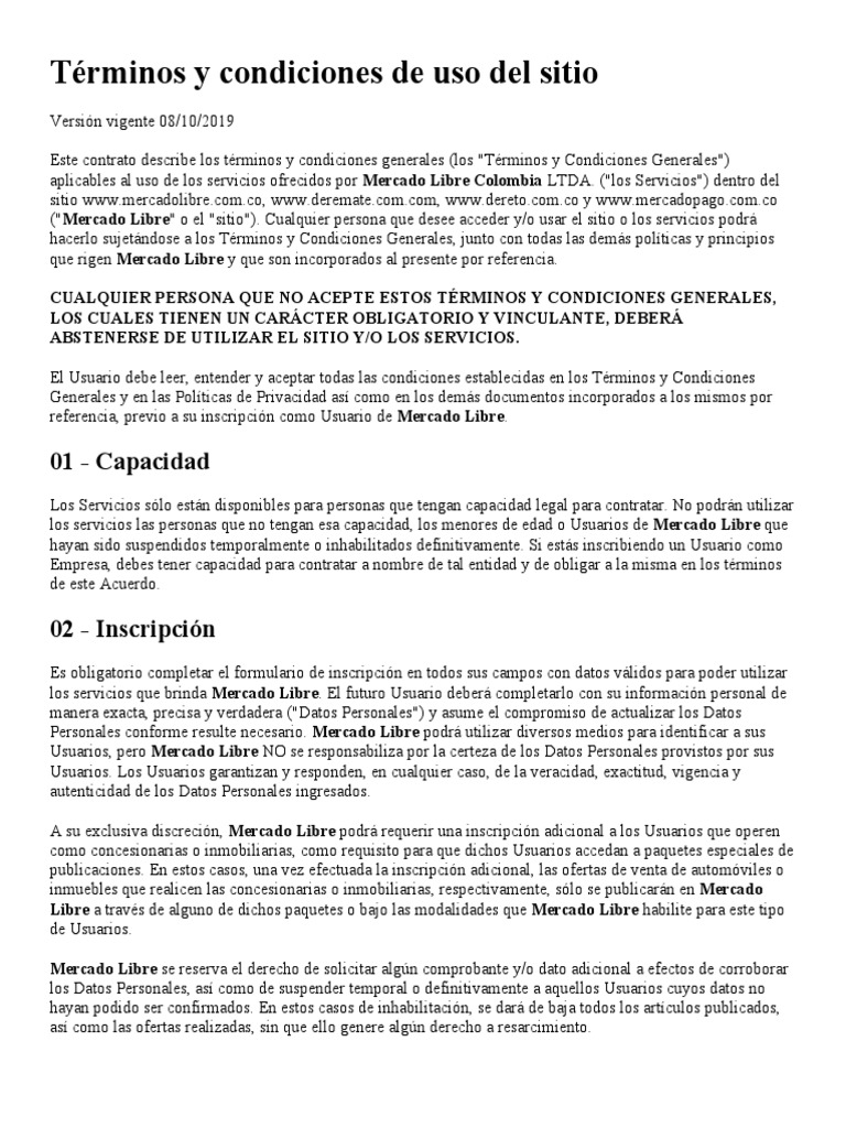 ("Mercado Libre" o el "sitio"). Cualquier persona que desee acceder y/o usar el sitio o los servicios podrá