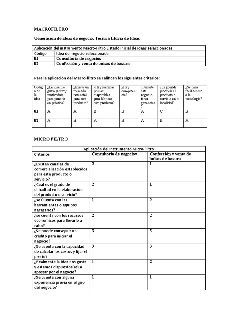 Aplicación del instrumento Macro-Filtro Listado inicial de ideas seleccionadas