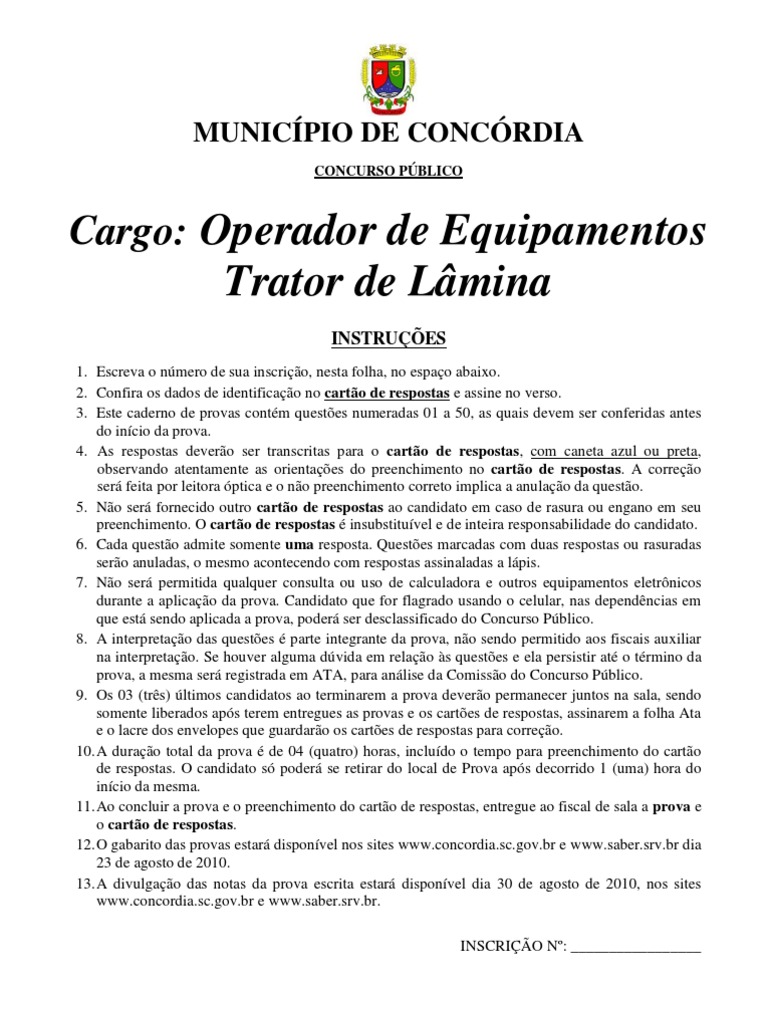 12. O gabarito das provas estará disponível nos sites www.concordia.sc.gov.br e www.saber.srv.br dia