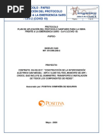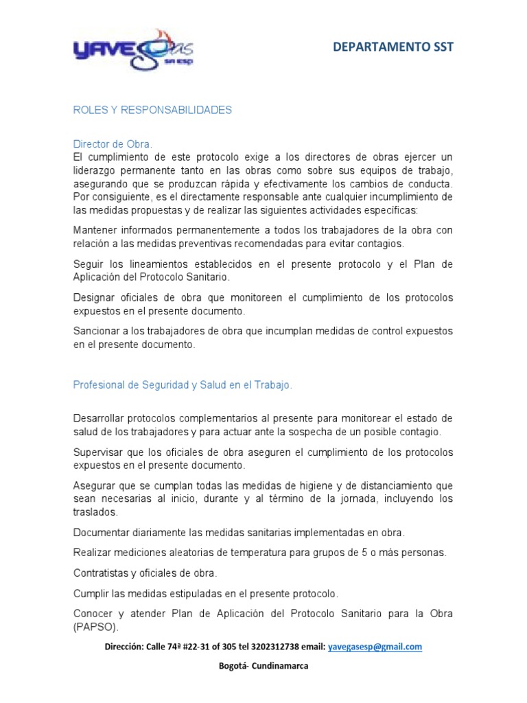 El documento establece las responsabilidades y roles del director de obra, profesional de seguridad y salud en el trabajo, contratistas, oficiales de obra y trabajadores de obra para garantizar el cumplimiento de los protocolos de seguridad y salud durante la pandemia. También indica que los supervisores deben apoyar estrategias relacionadas con la sanitización, comunicación, seguimiento, evaluación de riesgos y establecimiento de zonas seguras.