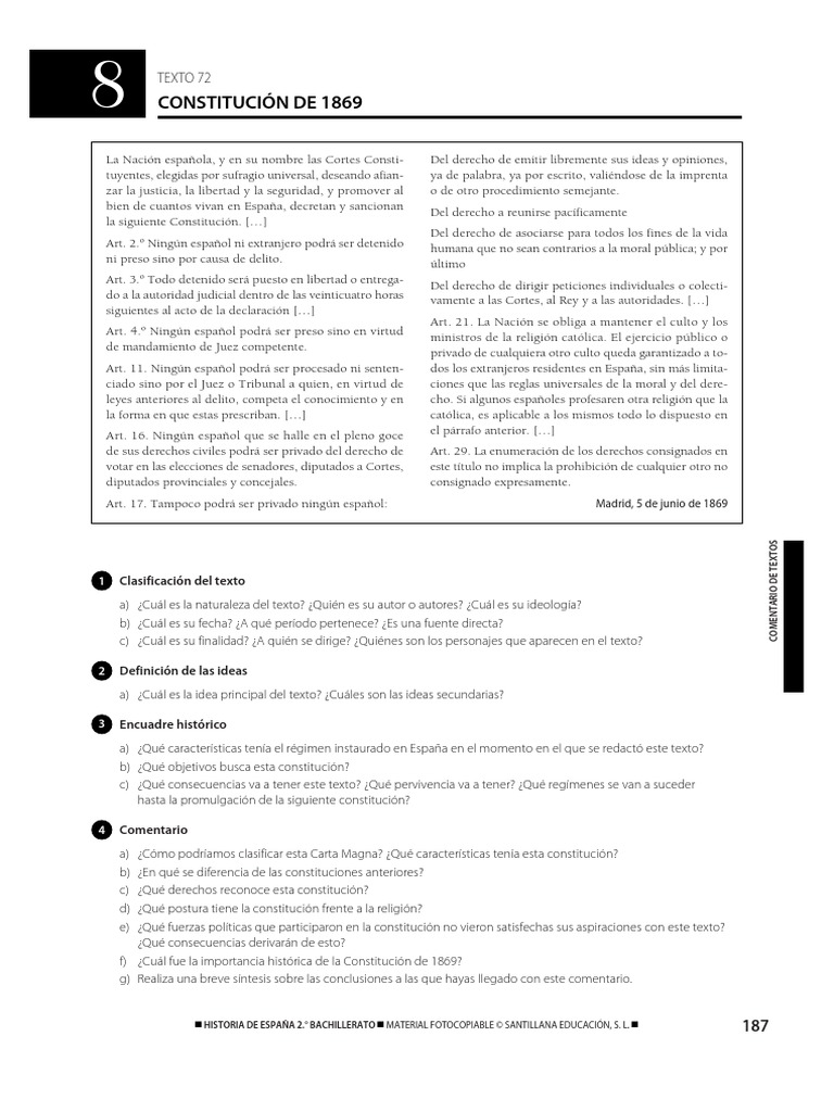 f) ¿Cuál fue la importancia histórica de la Constitución de 1869?