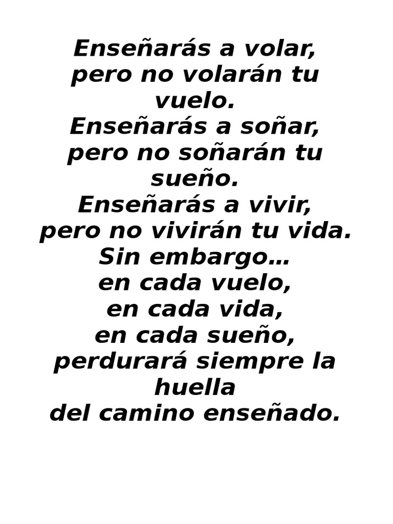 pero no volarán tu vuelo. Enseñarás a soñar, pero no soñarán tu sueño. Enseñarás a vivir, pero no vivirán tu vida. Sin embargo… en cada vuelo, en cada vida, en cada sueño, perdurará siempre la huella del camino enseñado.