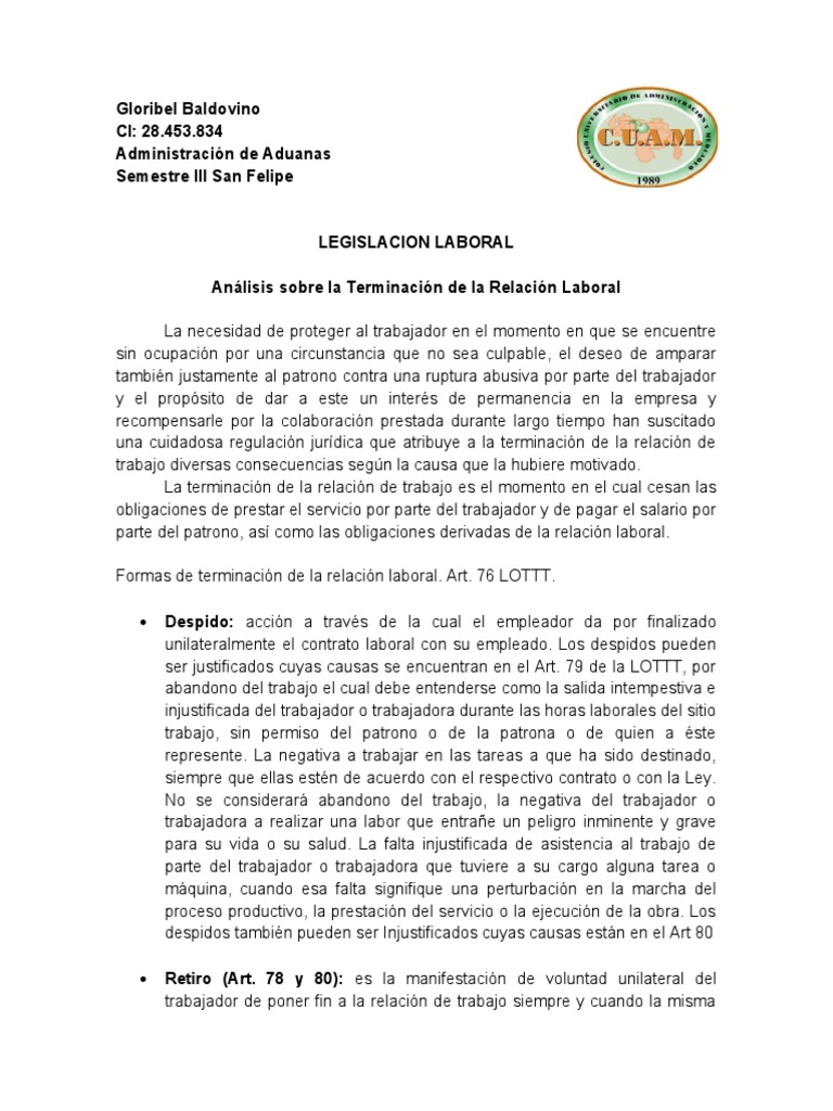 Formas de terminación de la relación laboral. Art. 76 LOTTT.