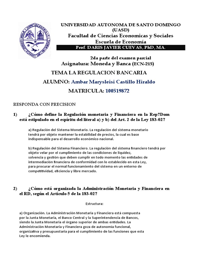 1) ¿Cómo define la Regulación monetaria y Financiera en la Rep?Dom