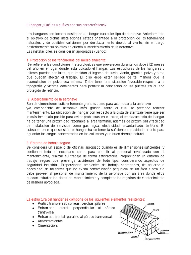 Aircraft hangars are primarily designed to house aircraft and provide protection from environmental phenomena and potential collisions due to wind displacement. Key characteristics include structures to prevent entry of rain, wind, hail, and dust, as well as a sealed floor to minimize dust accumulation. Hangars must be large enough to accommodate aircraft undergoing maintenance, with a location near runways to facilitate easy taxiing. They also need proximity to utilities like gas, water, and electricity, and provide a secure work environment, including separate work areas to prevent contamination. The structure typically involves elements such as pórtico transversal, lateral and frontal frameworks, along with foundation and doors, which might include options like canopy doors for efficient space utilization .