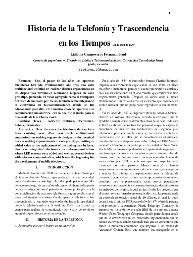 Resumen.- Con el pasar de los años los aparatos En el año de 1854, el innovador francés Charles Bourseul