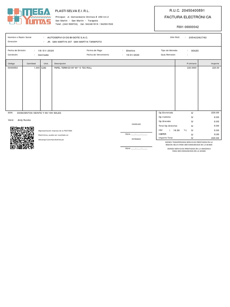 Fecha de Emisión : 15/01/2020 Forma de Pago : Efectivo Tipo de Moneda : SOLES