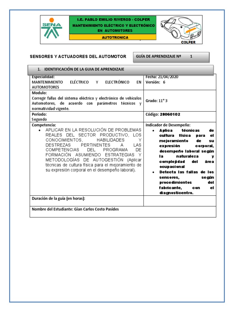 SENSORES Y ACTUADORES DEL AUTOMOTOR GUÍA DE APRENDIZAJE Nº 1
