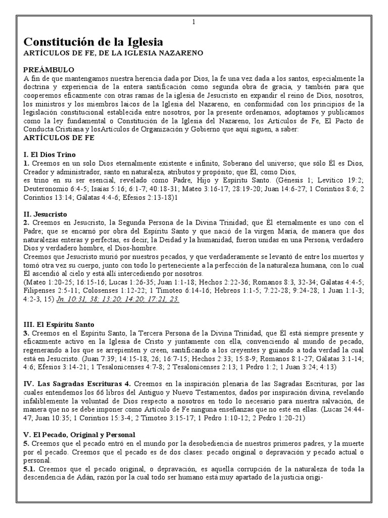 como la ley fundamental o Constitución de la Iglesia del Nazareno, los Artículos de Fe, El Pacto de