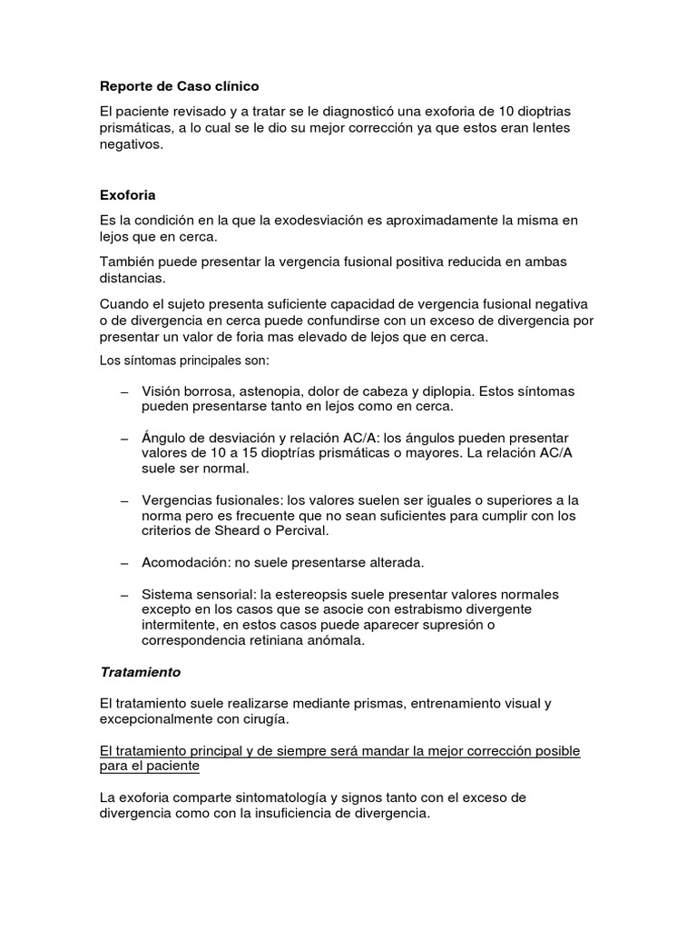 El paciente revisado y a tratar se le diagnosticó una exoforia de 10 dioptrias