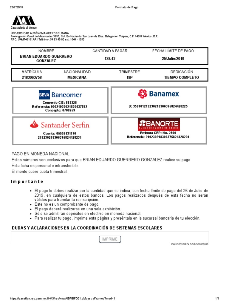 Para realizar tu pago, imprime esta página y preséntala en la sucursal bancaria de tu elección.