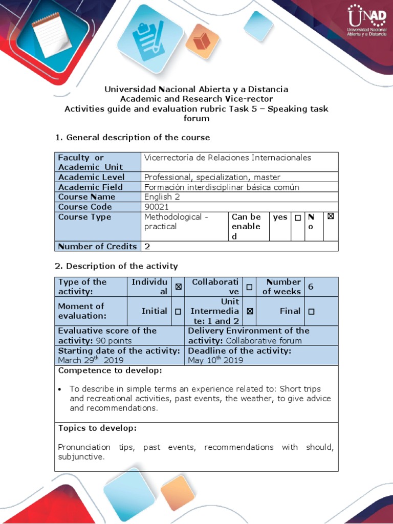 Activities guide and evaluation rubric Task 5 – Speaking task