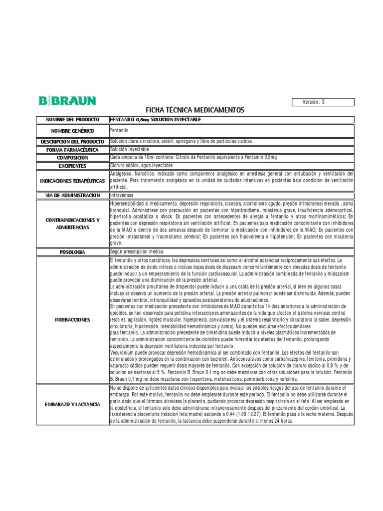 sódico al 0,9% o de glucosa al 5%. Fentanilo B. Braun 0,5 mg no debe mezclarse con otras soluciones para la inyección o
