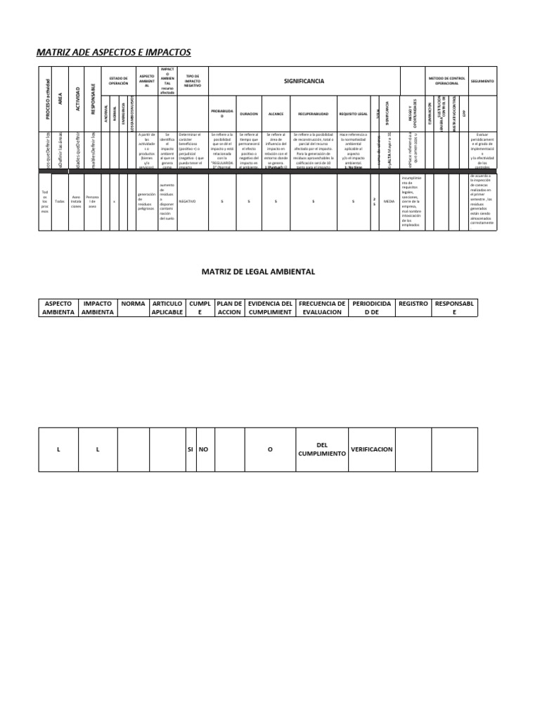 ASPECTO IMPACTO NORMA ARTICULO CUMPL PLAN DE EVIDENCIA DEL FRECUENCIA DE PERIODICIDA REGISTRO RESPONSABL