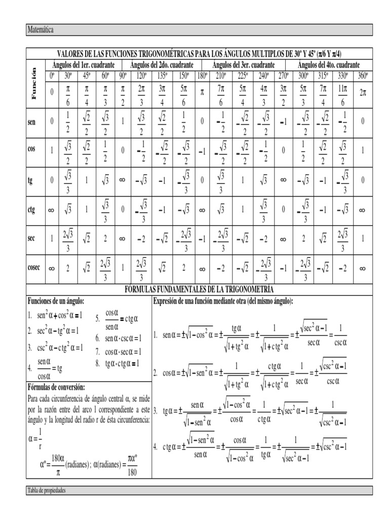VALORES DE LAS FUNCIONES TRIGONOMÉTRICAS PARA LOS ÁNGULOS MULTIPLOS DE 30º Y 45º (π π/6 Y π/4)