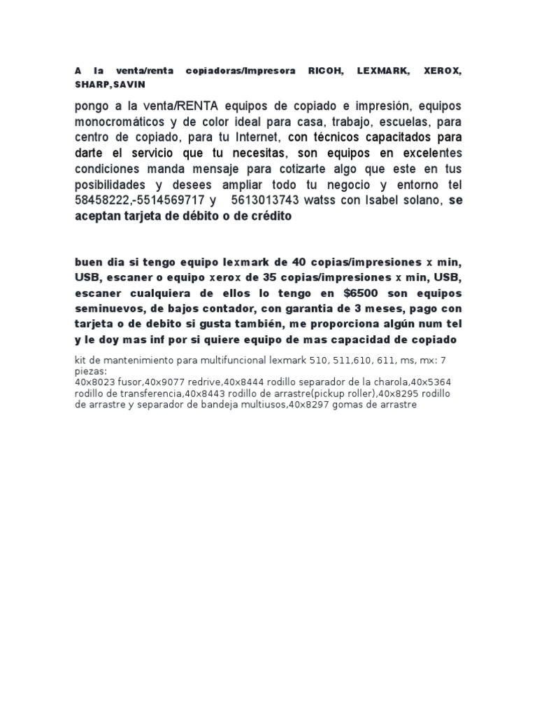 A la venta/renta copiadoras/Impresora RICOH, LEXMARK, XEROX,