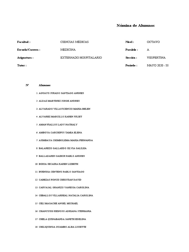 Asignatura : EXTERNADO HOSPITALARIO Sección : VESPERTINA