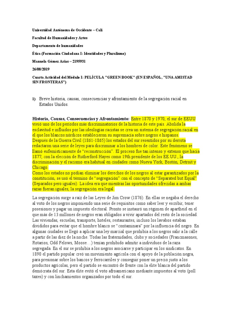 Cuarta Actividad del Módulo I: PELÍCULA "GREEN BOOK" (EN ESPAÑOL, "UNA AMISTAD