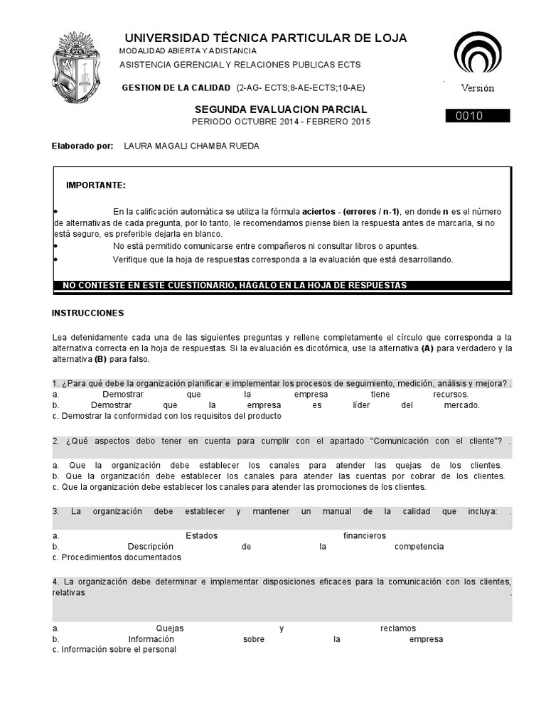 GESTION DE LA CALIDAD (2-AG- ECTS;8-AE-ECTS;10-AE) Versión