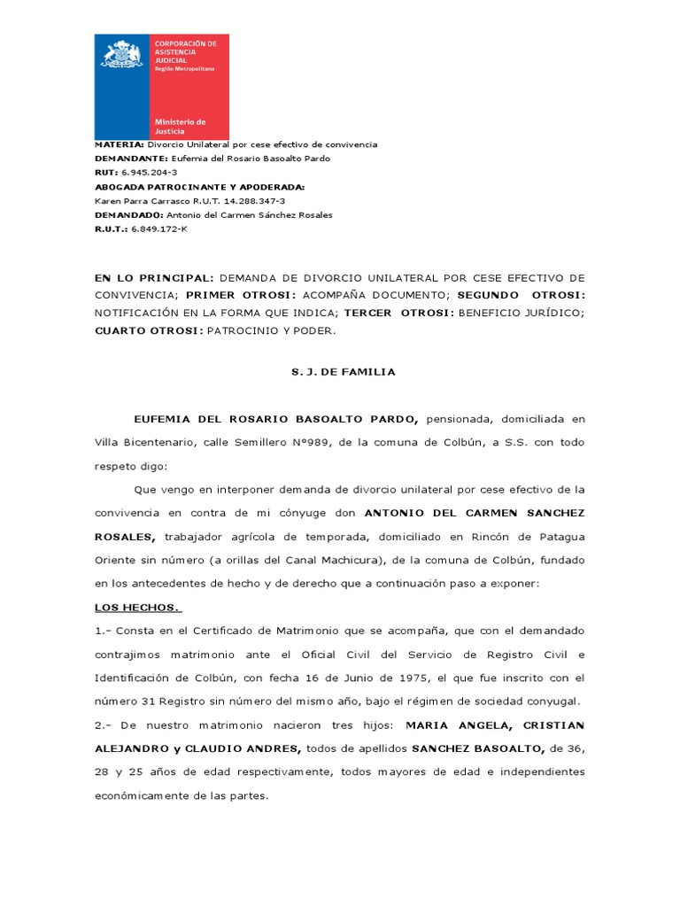 Que vengo en interponer demanda de divorcio unilateral por cese efectivo de la
