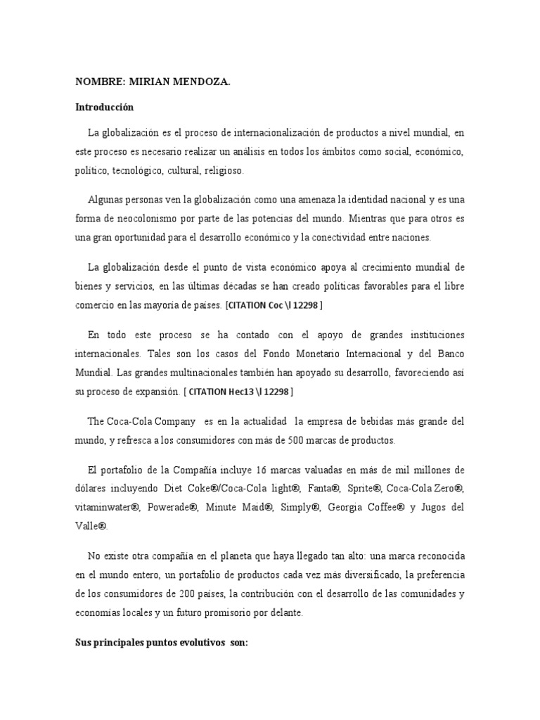 La Globalización de la Coca Cola Compani. Considera a los distintos instrumentos