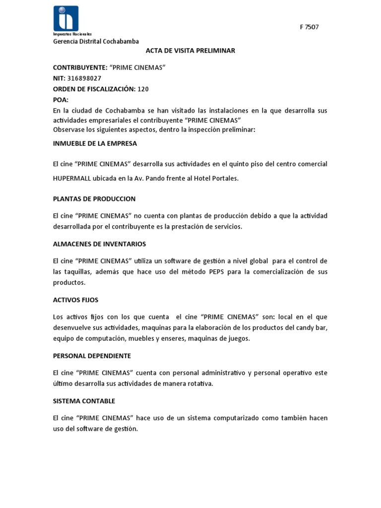 actividades empresariales el contribuyente “PRIME CINEMAS”