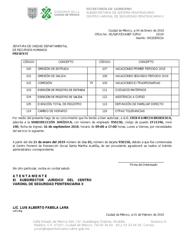 Oficio No. SG/SsP/CEVASEP II/RH/ /2019