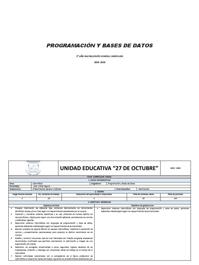N.º Título de la unidad de Objetivos específicos de la Contenidos Orientaciones metodológicas Evaluación Duración en semanas
