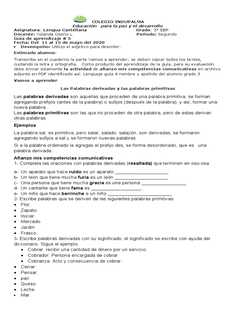 3- Escribe palabras derivadas con su significado, el significado se escribe con ayuda del