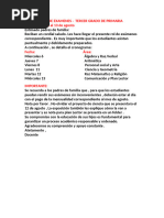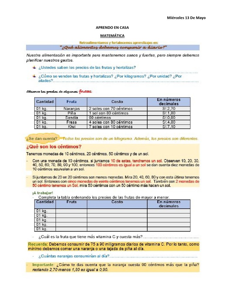 El documento presenta un calendario de actividades escolares para el miércoles 13 de mayo e incluye la asignatura de matemáticas, y para el jueves 14 de mayo la asignatura de personal social.