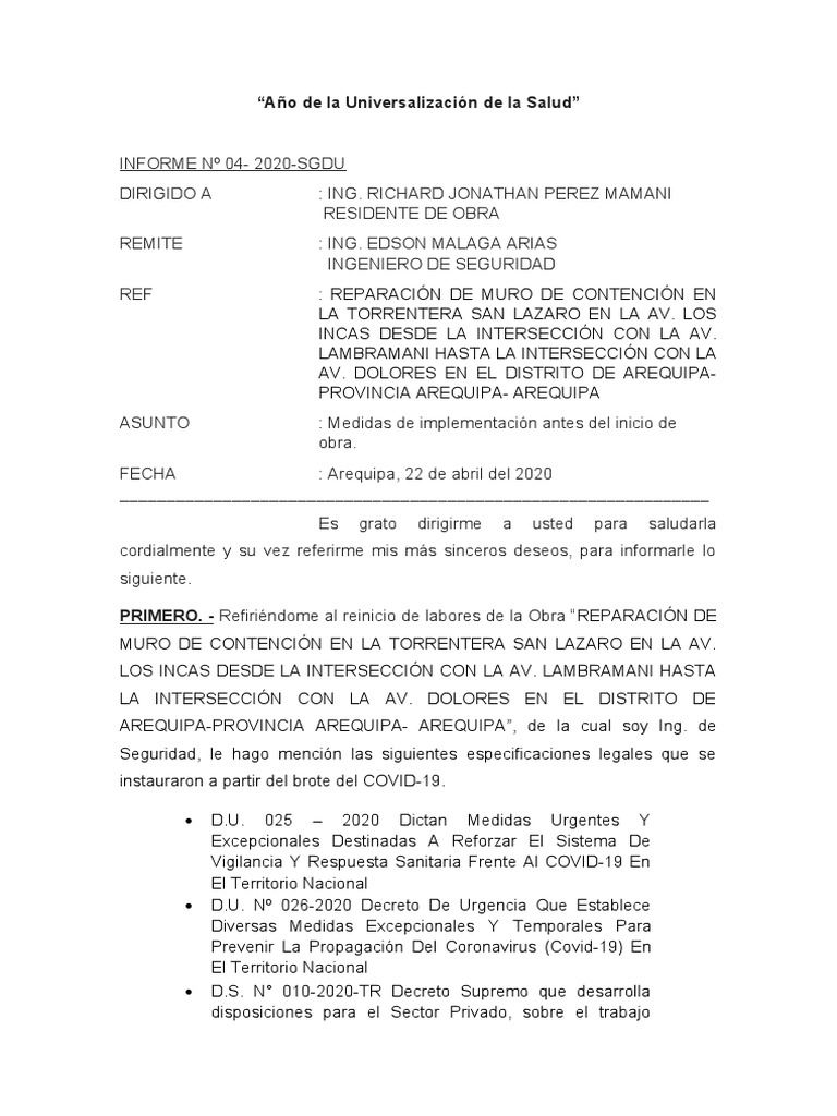 DIRIGIDO A : ING. RICHARD JONATHAN PEREZ MAMANI