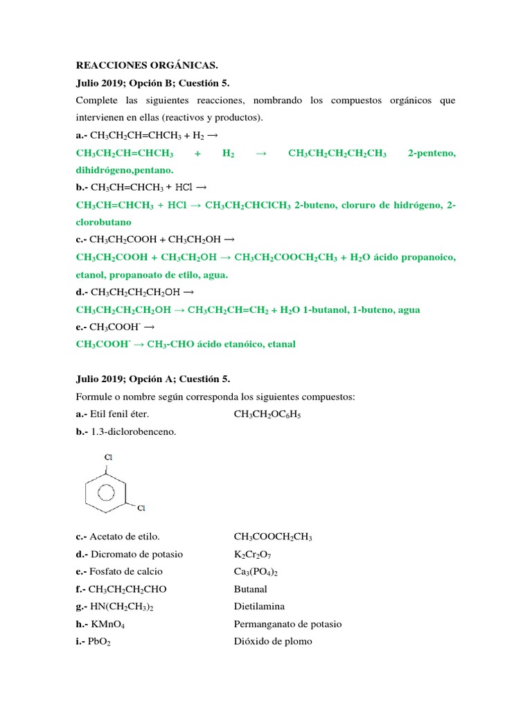 Completa las siguientes reacciones y nombra los compuestos orgánicos que intervienen