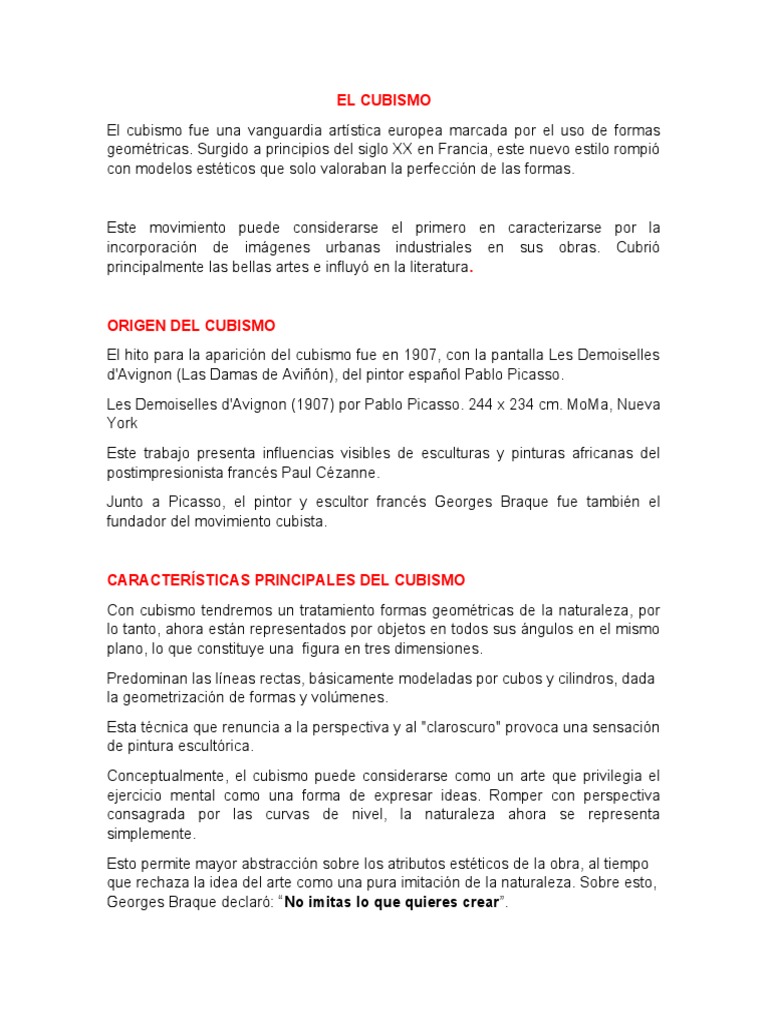 CARACTERÍSTICAS PRINCIPALES DEL CUBISMO