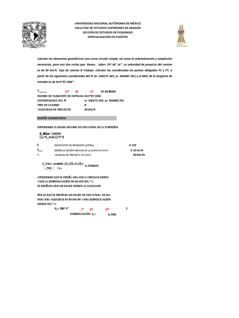 Calcular los elementos geométricos una curva circular simple, así como la sobreelevación y ampliación