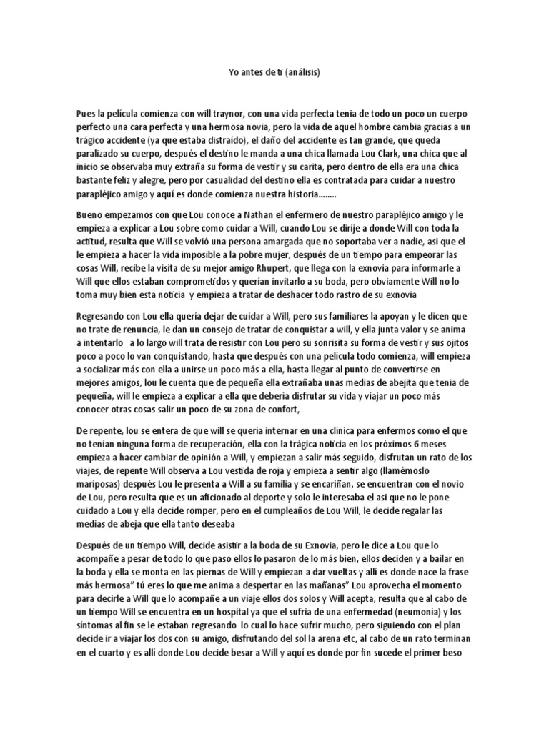 paralizado su cuerpo, después el destino le manda a una chica llamada Lou Clark, una chica que al