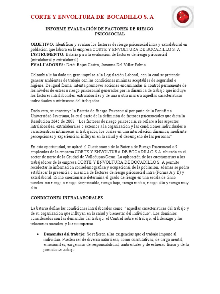 Evaluación de Riesgos Psicosociales en Corte y Envoltura de Bocadillo S.A.