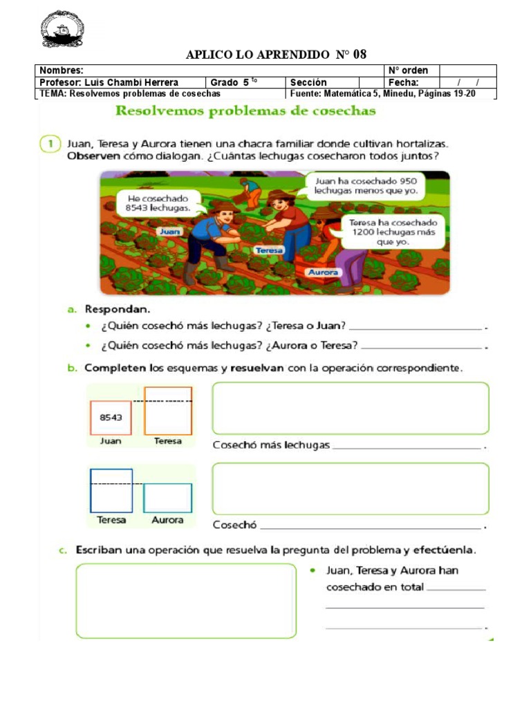 El documento habla sobre resolver problemas de cosechas en matemáticas para quinto grado. Los estudiantes deben calcular cuánto cosecharon varios agricultores y mostrar los pasos para resolver el problema.