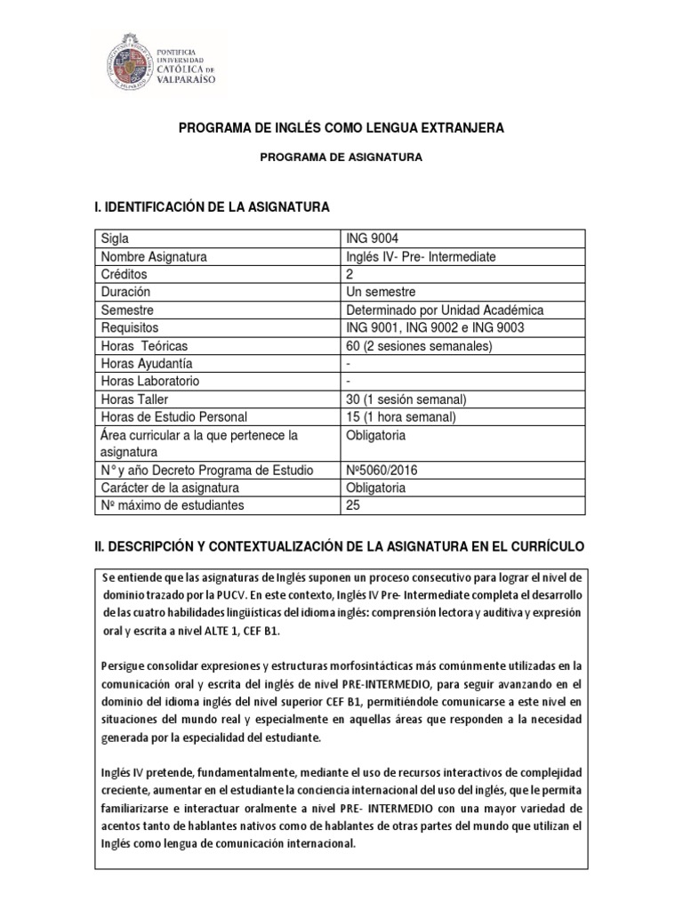 dominio trazado por la PUCV. En este contexto, Inglés IV Pre- Intermediate completa el desarrollo